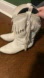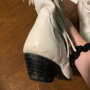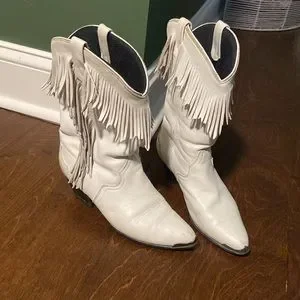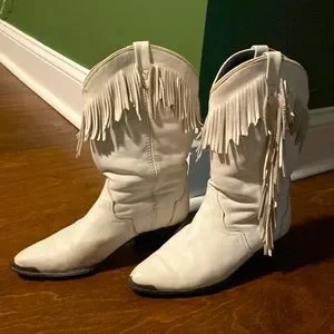 Vintage white fringe cowboy boots. Decent condition with some small scuffs. Selling because they didn’t fit me right. The size marking has worn off. My guess is they’re maybe a 6.5. I’m a 7.5 and they pinched my toes a little tighter than I could handle.