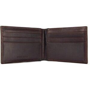 -Full grain leather in oil finish with pull up, six credit card pockets, billfold lined with Carhartt brown cotton duck fabric, ID window with thumb slide