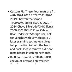 These are nice floor liners for 2019-2024 Chevy/GMC Silverado/Sierra 1500, 2020-2024 2500HD/3500HD Crew Cab (4 door) with the underseat storage compartment