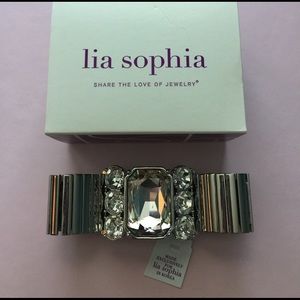 Lia Sophia Front Row Bracelet. Stretchy thick silver band with large super glam center rhinestone design.