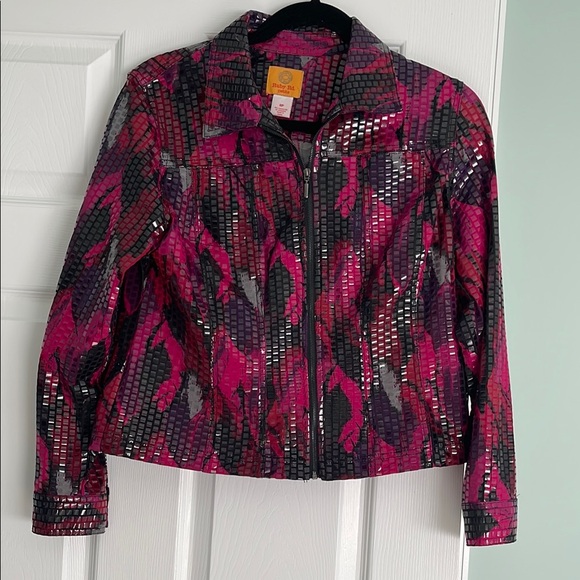 Vibrant dark pink/black/grey metallic look jacket with a bold pattern. Features a front zipper and long sleeves. Perfect for a stylish look.