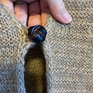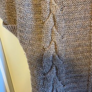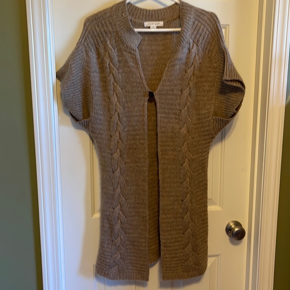 Short sleeve, knee length, one button closure cardigan like sweater.