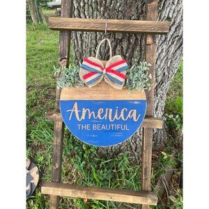 "America the beautiful" wood door hanger. 14 inch round and .3 inches thick. Includes thick wired twine for easy hanging on your door. Item has multiple top coats suitable for outdoor. This item does come distressed.