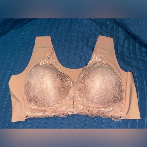 Brand new front hook bra. Never been worn. Pretty coral color. It doesn’t show correctly in the pictures for some reason. Size xxl but can fit xl as well. Cup size fits a C or a small D. Super light material. No under wire. Seamless back.
