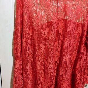 This elegant red lace blouse features intricate white accents, perfect for adding a touch of sophistication to any outfit. Ideal for both casual and formal occasions.