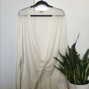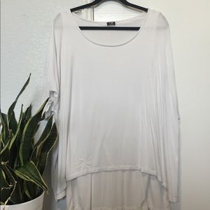 Selling two tops together (similar style). The front-twist top is closer to a cream and works well with a cute tank or bralette underneath. The oversized t-shirt is very soft and has a built in tank top underneath. (size L, runs big).