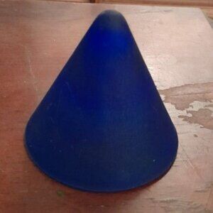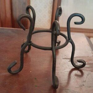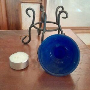 Curlicue iron stand with frosted blue coneshaped glass tealight candle holder. Two new, unused tealight candles included!