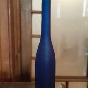 Decorative frosted blue glass tall bottle with cork, stands 11.5" tall with a 2.5" square base.