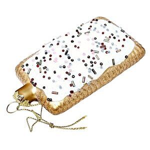 The ornament features frosted toaster pastry with sprinkles. This glass ornament measures 5" tall by 2.5" wide.