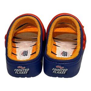 The "Frosted Flakes × Crocs Cozzzy Sandals" in size M 6/ W 8 feature a slip-on style with a solid blue color and Tony the Tiger character accents. These limited edition sandals from the Crocs Cozzzy Sandals line are lightweight, cushioned, and breathable, making them suitable for travel, activewear, parties, casual outings, workwear, and business settings. The outsole is made of rubber, and the synthetic lining and insole provide comfort. With a fun Frosted Flakes and Tony the Tiger theme, these sandals are a playful and nostalgic addition to any wardrobe.