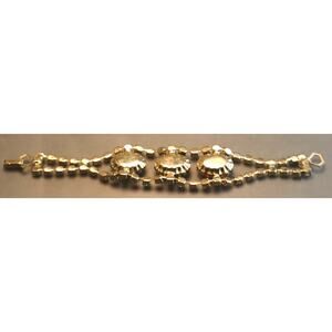 Amazing vintage bracelet featuring three large frosted satin glass stones flanked my chains of multi-color rhinestones. The center stones are pastel green, blue and peach orange and are in gold tone dogtooth settings. 1" at widest spots and 6 3/4" long with a foldover clasp. Nice vintage condition overall...with a couple of issues. The central stones do have some light abrasions on top, and the rhinestone chain above the blue center stone might have one replaced stone -- there are three soft yellow rhinestones in a row there, and none of the other colors repeat three times. Could be original or one stone could be a replacement, I don't know. Also it looks like the loop that receives the clasp was repaired, as the underside has some messy solder and a bit of green oxidation. Still looks beautiful!