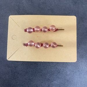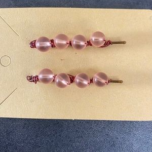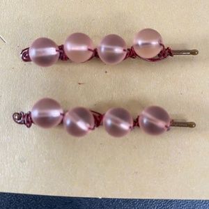 Pink Round beads wrapped onto bobby pins with metallic dark red colored wire.
