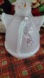 Charming frosted snowman figurine. Features silver accents on hat and scarf. Perfect for holiday decor.