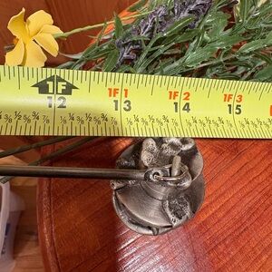 Frosty the Snowman pewter candle snuffer. Candle snuffers are used to safely extinguish candles. Instead of blowing out a candle, which can scatter hot wax and produce smoke, a snuffer gently deprives the flame of oxygen. This particular snuffer is made of pewter and features a snowman design, complete with a top hat and scarf. The snowman's head acts as the snuffer, while a long handle allows for safe and easy use. Candle snuffers like this one are often collected as decorative items, particularly around the holidays. Perfect for creating a festive atmosphere. Any questions leave in comments please.