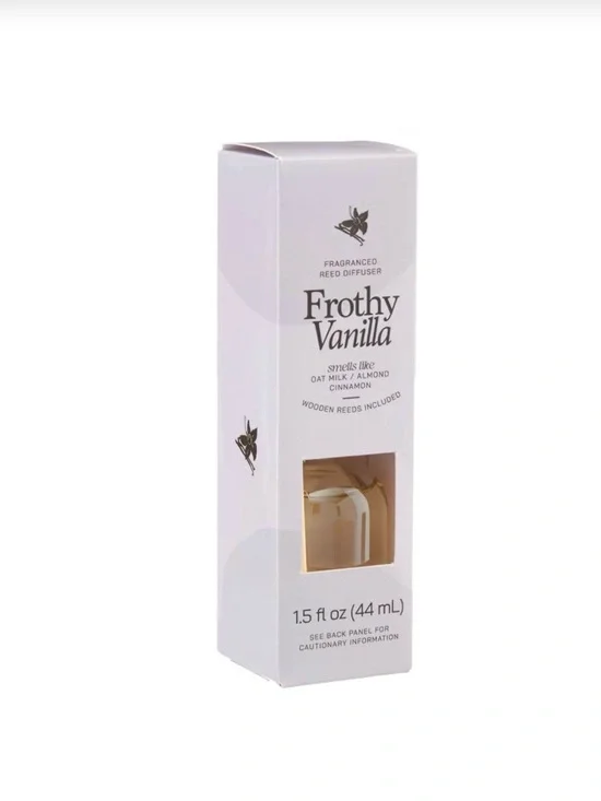 Vanilla reed diffuser delivers a warm vanilla scent with notes of oat milk, almond, and cinnamon. Easy-to-use diffuser includes wooden reeds for continuous fragrance. White packaging and clear glass bottle add a clean, elegant look to any room.