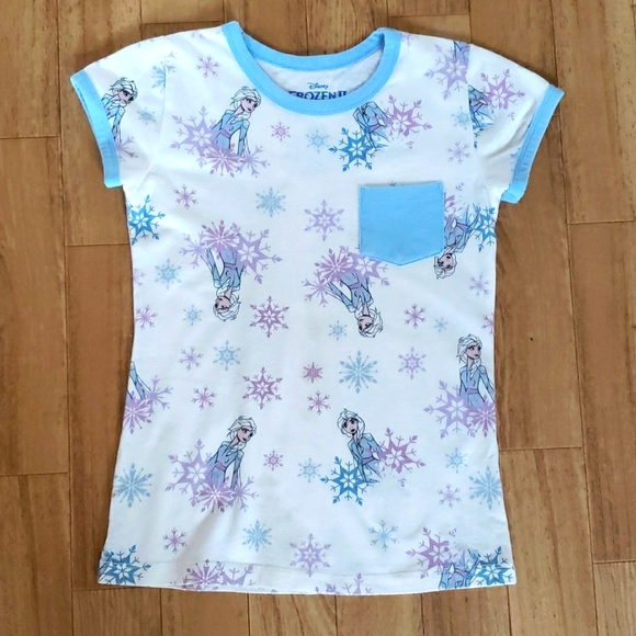 EUC Disney Frozen 2 Elsa Ringer Top! Size 7/8. Super cute pattern and blue pocket. Gently worn. No stains, no holes. Graphics are excellent! Measures 17.75" armpit to armpit and 20" length shoulder to bottom hem. Medium weight fabric for Spring, Fall and Mild Winters.