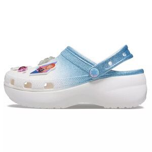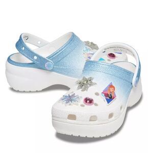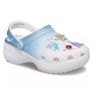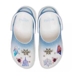 Feel like a force of nature in these glittering, shimmering Frozen clogs by Crocs. An allover ombre glitter design is accented with vinyl Jibbitz charms including Elsa, Anna, colorful gems and sparkling snowflakes. Part of the Frozen Forces of Nature Collection, these super comfy Crocs sparkle with fun.