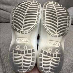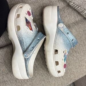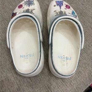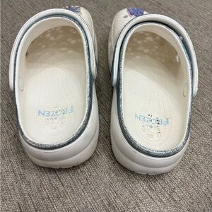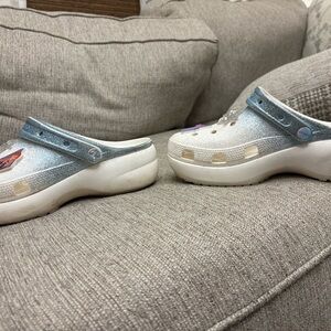 Step into a world of magic with these Frozen-themed CROCS.. Featuring a charming blue and white design, these shoes are perfect for little fans of the beloved story. Comfortable and stylish, they are ideal for everyday adventures. USED CONDITION
