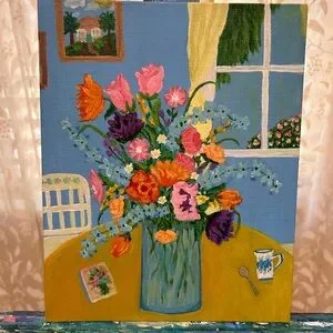 Introducing 'Frozen In Time,' a mesmerizing still-life painting that captures the essence of time standing still. This abstract masterpiece, painted in acrylics on a 10 x 12 canvas board, showcases the artist's skillful use of color and texture, inviting you to embark on a journey through time and space.