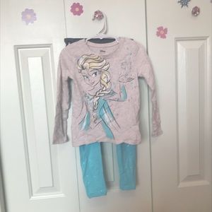 Oatmeal colored top, with Elsa, and blue sparkly leggings