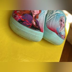Toddler size 9 frozen crocs with Elsa and Ana, the straps on these are short so with straps on, they are more like size 8, with straps flipped up, true size 9. See photos for wear