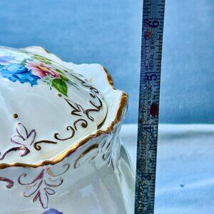 This is a classic example of a Fürstenberg bonbonniere, which is a lidded porcelain dish used for anything from candies to trinkets. Fürstenberg porcelain originated in 1747, and is Germany's second-oldest porcelain manufacturer. Classic design elements for items of this sort manufactured by Fürstenberg are floral patterns and gold trim. The handle on the lid is broken, and the price has been lowered significantly because of it. A Fürstenberg piece like this in good condition would go for anywhere between $60 and $300.