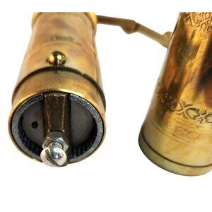 This Frugal Gourmet tall brass pepper mill brings style and functionality to the kitchen or dining table. Handcrafted in Greece, it features beautiful etched detailing and solid brass construction, ensuring durability and striking aesthetics. It boasts a classic manual grinding mechanism for freshly ground spices, enhancing the flavor of meals. The grinder measures 11 inches in height, making it a standout piece while providing ample capacity to hold peppercorns or other spices. Designed with an adjustable grind setting for fine to coarse texture, this mill combines timeless design with efficient functionality. Top to bottom = 11 inches. Minor tarnishing and wear consistent with age; no notable flaws affecting functionality. Inside is nice and clean.