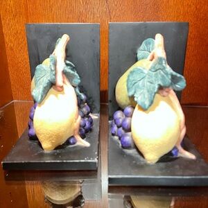 Enhance your home decor with these elegant fruit design bookends. Featuring a vibrant mix of green, purple, and black, these bookends add a touch of sophistication to any room. Made of a resin or ceramic type material.