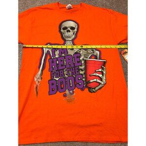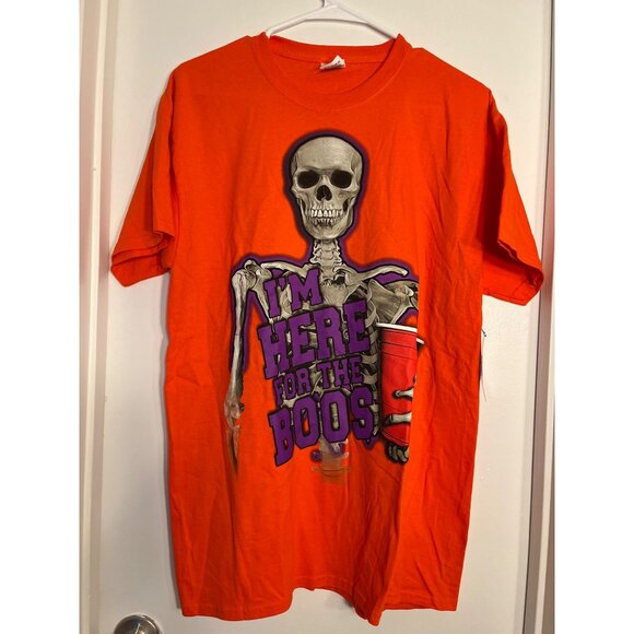 A spirited tee for Halloween revelry, this bold orange shirt with a cheeky skeleton and "I'm Here For The Boos" graphic is party-ready fun.