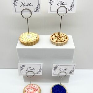Add a sweet touch of charm to your table setting with these Fruit Tart Place Card Holders. Handmade from durable polymer clay, each slice looks like a realistic mini fruit tart — Blueberry, Apple, Banana, Strawberry. A sturdy silver metal loop holder is embedded in the center, perfect for holding name cards, food labels, table numbers, or small photos.