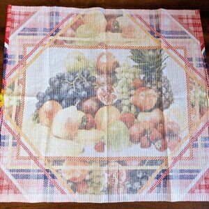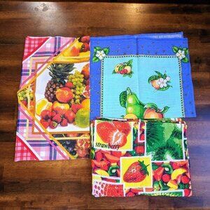 Approx. Measurements Laying Flat: Blue Rectangle: 20" x 28", Fruit Bunch: 22.5" x 20.5", Strawberry Hot Pads: 11" x 14.5"