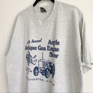Grey soft Crewneck tee from 90s engine show event. Some small stains throughout. Small holes on neck (pictured).