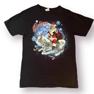 Fruit of the Loom Cotton Believe Kitschy Santa Cat Christmas Tee Navy Blue S. Short sleeve tshirt. Santa cat riding reindeer cat. 100% cotton. Gently used Good Preowned Condition. No holes or stains.