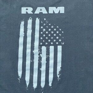 Crew neck short sleeve t-shirt on Fruit of the Loom HD Cotton. Graphic screen printed on the front of the chest with the Dodge Ram logo. The back has an American Flag and the word “RAM.”