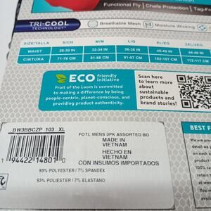 The Fruit of the Loom Men's Breathable Micro-Mesh Boxer Briefs 3 Pack in size XL offers a comfortable and stylish underwear option for men. Made from a blend of polyester, spandex, and mesh, these boxer briefs feature a solid multicolor design and a quick-dry, breathable fabric. With features like a coolzone support pouch and tri-cool technology, these boxer briefs provide support and comfort throughout the day, making them ideal for active men or those who prefer a colorful and sporty style. Made in Vietnam, these boxer briefs come in a pack of three, providing a great value for the price.