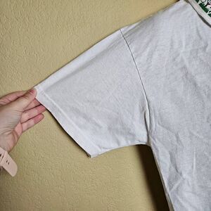 This is a short sleeved white polo shirt by Fruit of the Loom. On the chest is the word "golf" in gold, surrounded by different golf items such as clubs, balls, and a bag. Above that are small rhinestones. On the collar are printed golf balls.