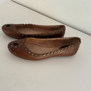 Frye leather flats, colour 'cognac' . Stud around the edge and at the peekaboo toe opening. Super soft leather and sole.
