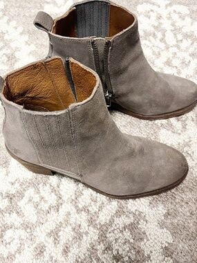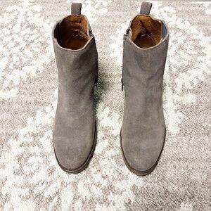 Frye Alton Chelsea Grey Suede Bootie Boot Women’s size 7 stacked heel Side zip closure for easy on and off. booties, western, casual, earth tones