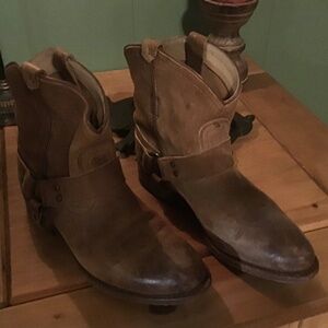 Cute! Cute! Cute! Love these! Low heel, super cute perfect distressed leather, more of a tan meets light brown. Super cool harness, round toe. See all pics for measurements. These fit true to size.