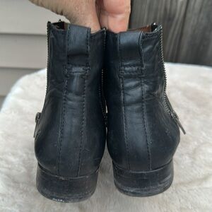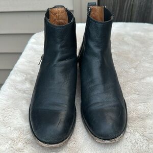 These Frye ankle boots feature a sleek black leather design with a distinctive diagonal zipper. The minimalist style and rounded toe make them versatile for various outfits, while the soft leather ensures comfort for all-day wear. Does have a small snag on the side of one of the boot see photos.