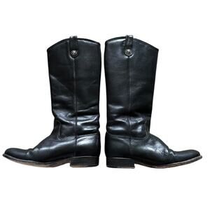 Iconic Frye Melissa Button tall riding boots crafted from rich black leather. This classic pull-on style features the signature Frye button detail at the shaft, a low stacked heel, and a timeless equestrian silhouette. Known for durability and quality craftsmanship, these boots only get better with wear.