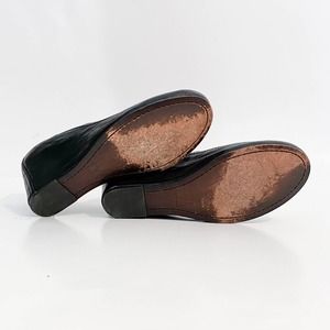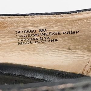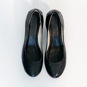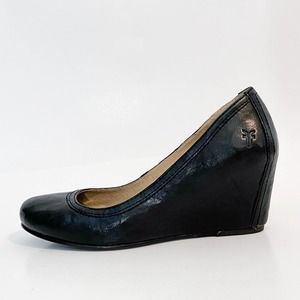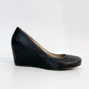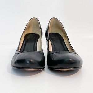 Elegant black leather wedges. Classic design with subtle branding. Perfect for any occasion.