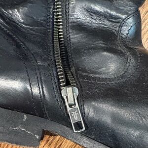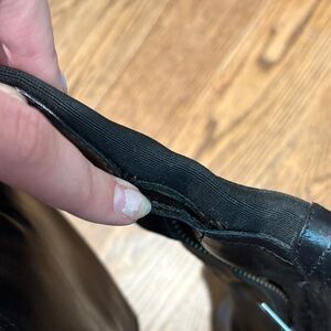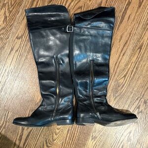 Sleek black leather. Over the knee style. Buckle detail at top.