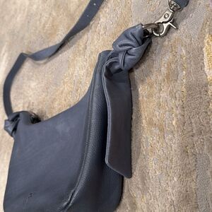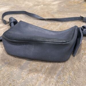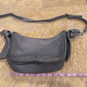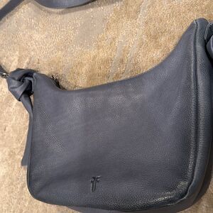 Stylish Frye crossbody bag. Elegant blue leather. Knot details on strap.
