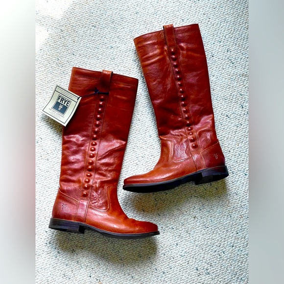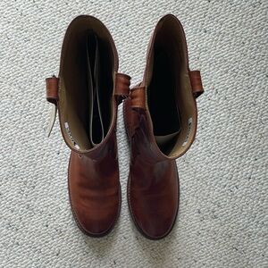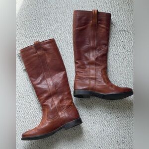 NWT. Never worn, box included. These boots are pull on style, leather and gorgeous whiskey color. They are TTS. Approximate measurements: 1” heel, 16” height. See pic for other measurement.