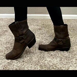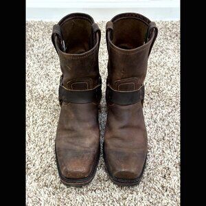 Stylish Frye combat boots. Rich brown leather. Sturdy design with buckle detail.