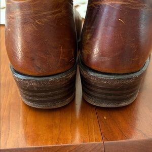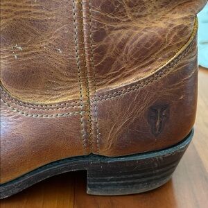 This is a pair of FRYE True Vintage Black Label Original Rio Grande size 7 Western Boots. Made in the United States, these boots feature a solid pattern, square toe shape, and slip-on closure. The dark Carmel saddle color, cowboy theme, and leather materials give these boots a classic western look. *These boots are vintage and have wear and stains on the boot. See pictures.