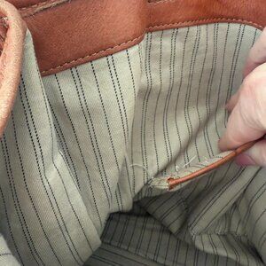 This is a beautiful leather tote by Frye. It features sturdy handles and a spacious interior. Perfect for everyday use, it is a Frye Campus leather cognac tote shopper shoulder bag. There is a small tear on the inside. See photo.
