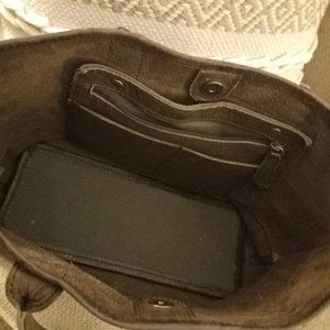 Lovely Cara tote. 28" x 10". inside detachable pockets, snap closure. Leather recently reconditioned . Smoke color