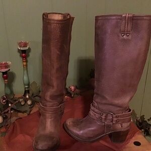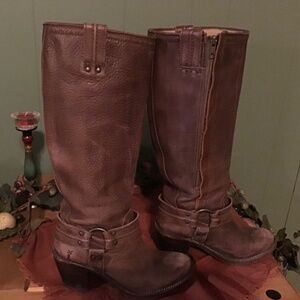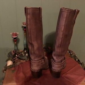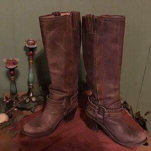 This is probably the cutest boot Frye ever came out with. Who doesn’t love the Carmen? This is a pre-owned pair with tons of life left in them. They are Chocolate Brown, they have a 15” shaft with 17” opening. A super cute 3” heel, round toe and the sexiest harness ever. I had a cobbler add an inside zipper to these for easy on and off. There are scuffs and wear mostly on the toes, but that just adds character, I think. Please refer to photos.